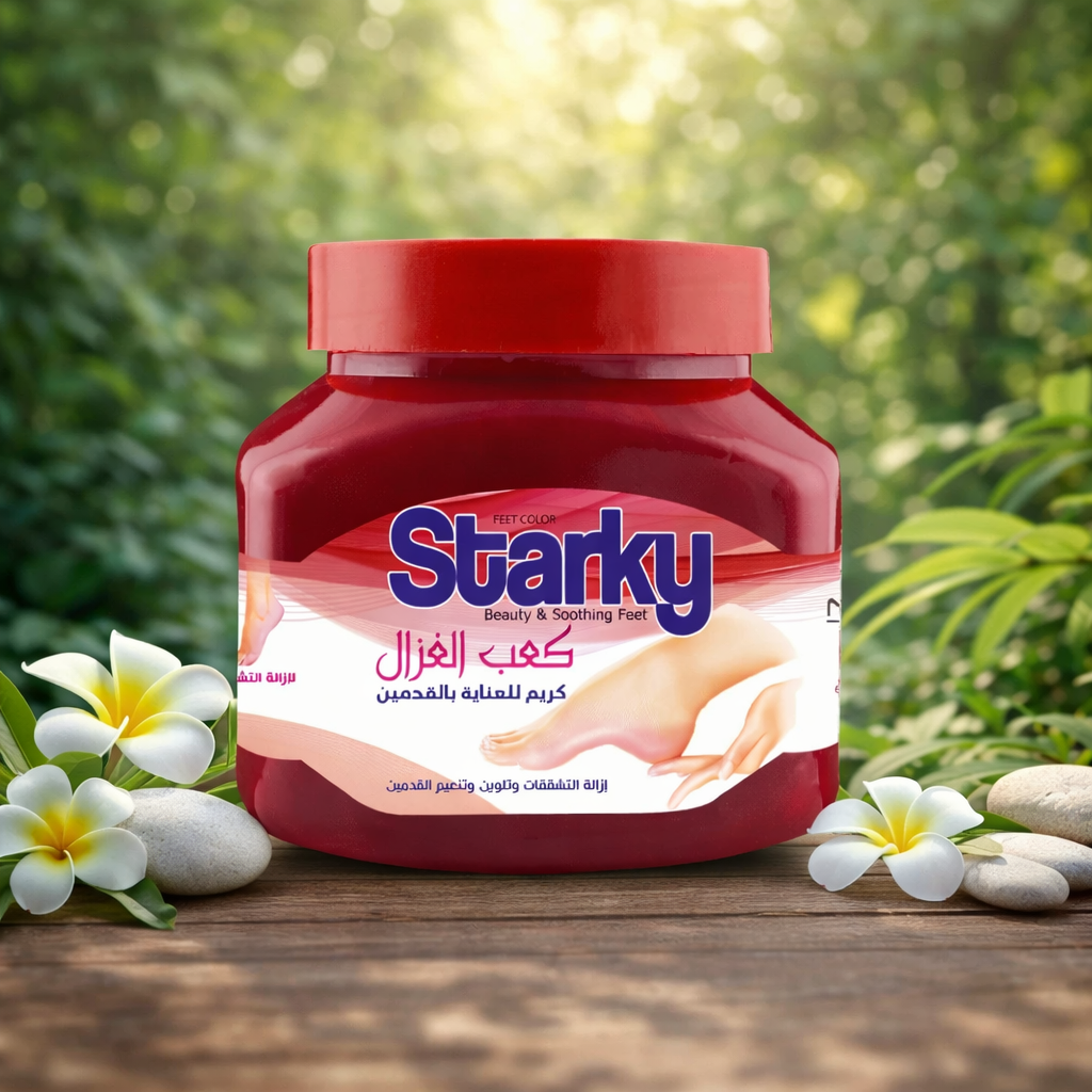 ستاركي كريم كعب غزال هو لتلوين كعب القدم وجعله يبدو أكثر جاذبية وأناقة ويحتوي على مكونات طبيعية وفعالة تعمل على تغذية وترطيب الجلد، مما يساعد على تحسين مظهر الكعب.