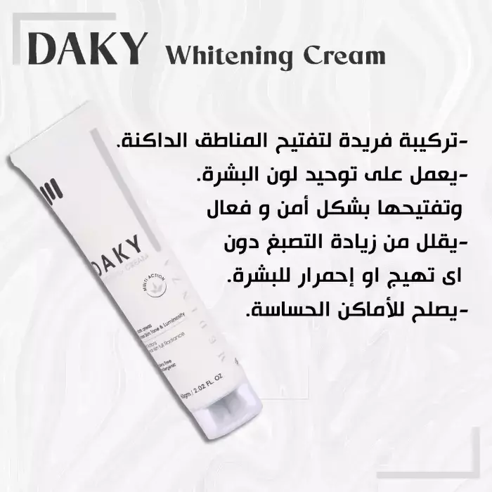 غير التفتيح، داكي كريم بيحافظ على رطوبة البشرة طول اليوم، وبيمنع تقشر الجلد أو الإحساس بالشد اللي ممكن تحسيه مع باقي كريمات التفتيح.