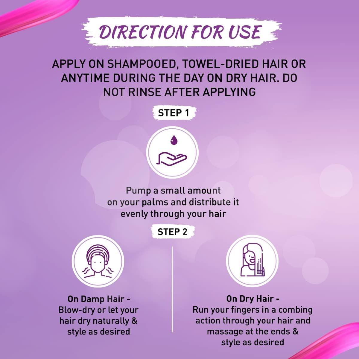 طريقة الاستخدام: يُوضع على شعر مغسول ومجفف بالمنشفة، أو في أي وقت خلال اليوم على شعر جاف. لا يُشطف بعد الاستخدام.