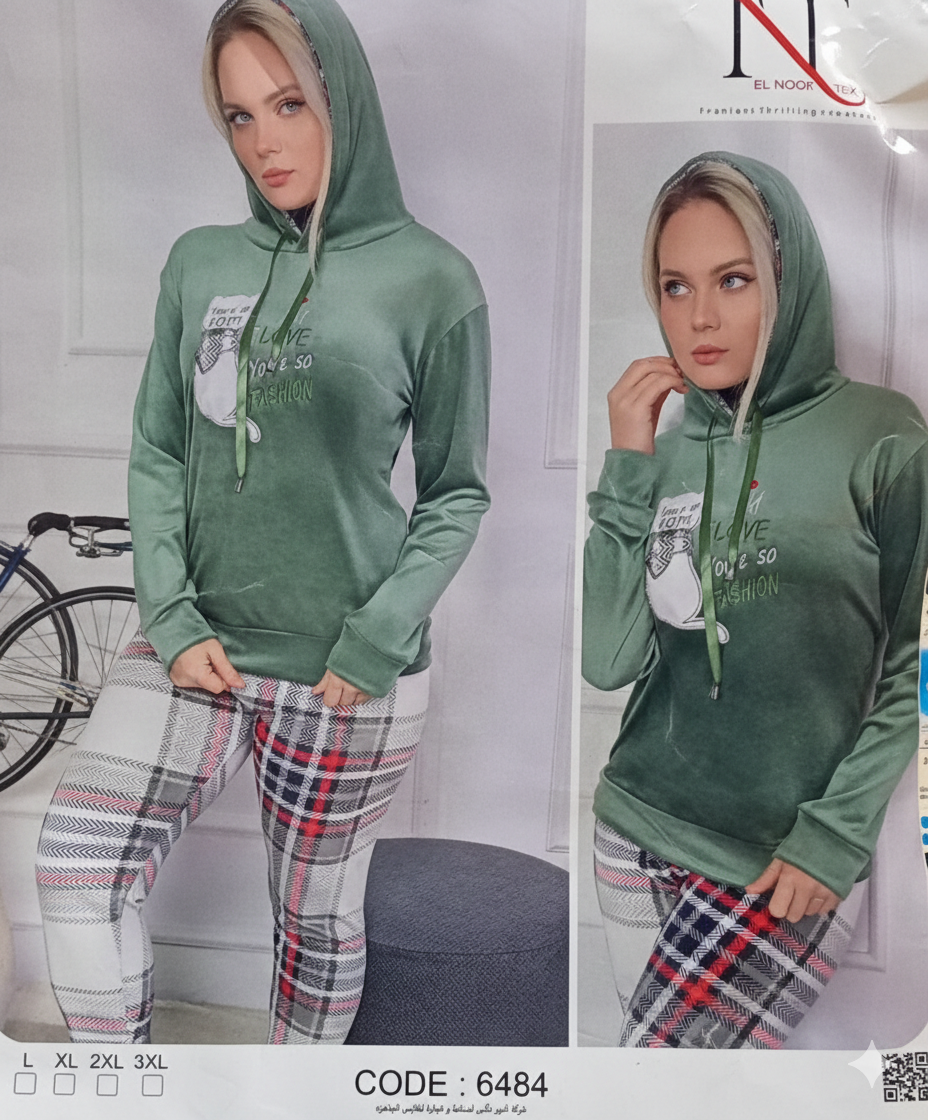 بيجامة قطيفة نور تكس قطة علي الصدر بنطلون كاروهات